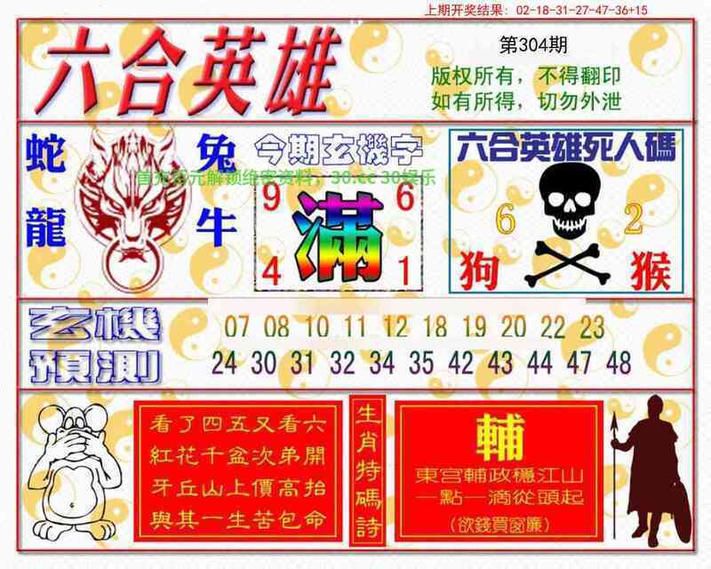 301期 龙前龙后狗站中 四七一对码来一 看四回三到天明 九跟必中牛必到 解译:龙前龙后狗站中指龙,看四回三到天明指天肖牛马龙兔猴猪,跟必中牛必到指牛 九肖:牛马龙兔猴猪鸡狗鼠 六肖:牛马龙兔猴猪 三肖:牛马龙 一肖:牛 |